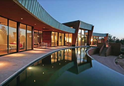 The same pale red Arizona flagstone was used in a random pattern to form the upper deck area. “The whole house follows a continuous curve, but the swimming pool needed a different radius,” Andreoli says.