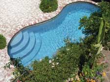 Inside the pool, a flagstone sit-down table with black umbrella serves a playful, as well as practical, purpose: While the clients enjoy refreshing drinks, the table appears to be suspended in the water.