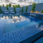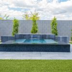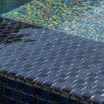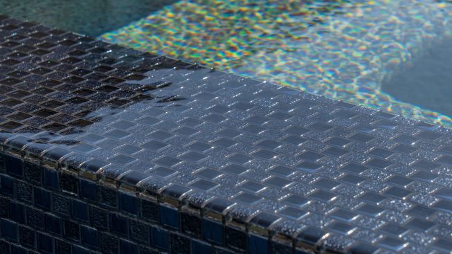 On the spa itself, the exterior of the raised overflow wall is finished in iridescent glass mosaic tile.