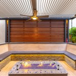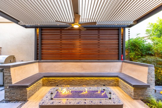 The trellis covering the firepit features an aluminum structure, with the slats on top painted to match the wood used on the other arbor. Wood-patterned tile, which can be found inside the house, is used on the flooring around the firepit.