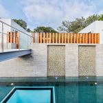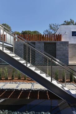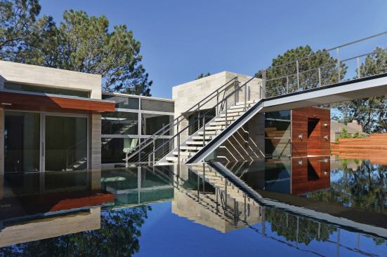 On the vertical: A hillside location and strict local ordinances meant the pool for this property had to be placed at the front of the house, at a higher elevation. Just behind the pool, at a higher elevation, is a motor court, built there so that it wouldn’t count as square footage of the home according to ordinances. A bridge and stairs lead to the pool. The gentle waterwalls falling into the vessel indicate Skip Phillips’ preference for subtle changes in plane and grade. They also provide a highly vertical feature to connect the pool with the motor court above. Architect Ronald Wilson’s choice for the fence adds another vertical rectangular element. Wilson selected 8-by-8-inch redwood and placed the planks 4 inches apart, tight enough to stay within local law but far enough apart to provide a sense of openness and flow.