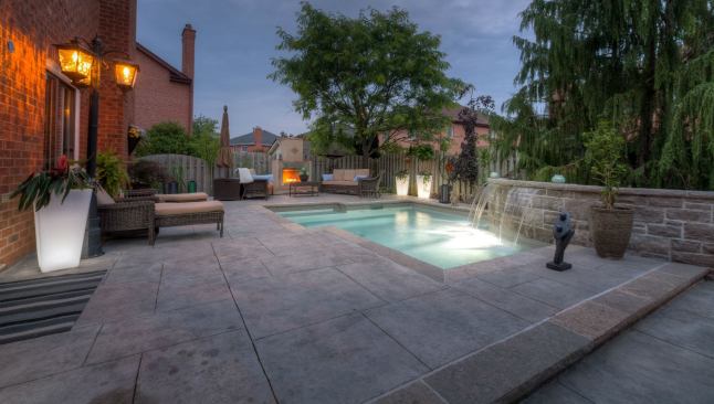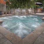 Root cause: Luff carefully designed the outdoor living area around a handsome Siberian spruce that sits dead-center in the yard. “What I wanted to do is have their living space from the east part of the yard meet with the water on the west part of the yard, and have that tree as the focal point,” Luff said. To achieve this, the designer erected a 3-foot-high semicircle wall with sheet waterfalls around the tree. This required a custom radius panel for the corner of the pool/spa below the natural stone wall. Wiarton ledgerock was chosen for the wall because it is native to the area.