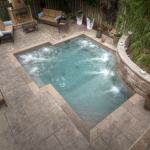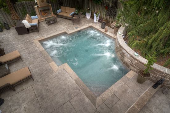 Hot spot: A suburban backyard in Toronto, Ontario got the pool/spa hybrid its owners envisioned — and within budget — by going an unconventional route. Rather than fiberglass or shotcrete, which lay out of the homeowners’ financial reach, Marc Luff presented an affordable alternative. Measuring 15-by-18 feet, the vinyl-lined vessel can achieve 100+ degrees. A perimeter shelf allows guests to skirt around a 6-foot deep end. They can sit a spell on benches on either side. To ensure a snug fit over the steel accoutrements, a subcontractor fitted and heat-welded the liner on site. To lend the water a tropical hue, the designer suggested the tan liner with a sandstone-like print.