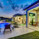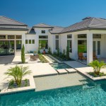 For integration with the home, the team treated the pool like a giant waterfeature. A runnel type feature with bubblers runs through the courtyard, connecting to the inground spa on the way to a sizable sunshelf, which then provides entry to the main pool. A 4-foot raised wall with brass scuppers provides the backdrop opposite the home.