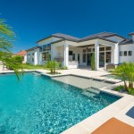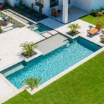 Pebble finish is used on the interior and the sun shelf. A straight-edged, gray-toned Lueders cut stone is used for the coping. The deck is finished in a porcelain tile that closely resembles travertine.