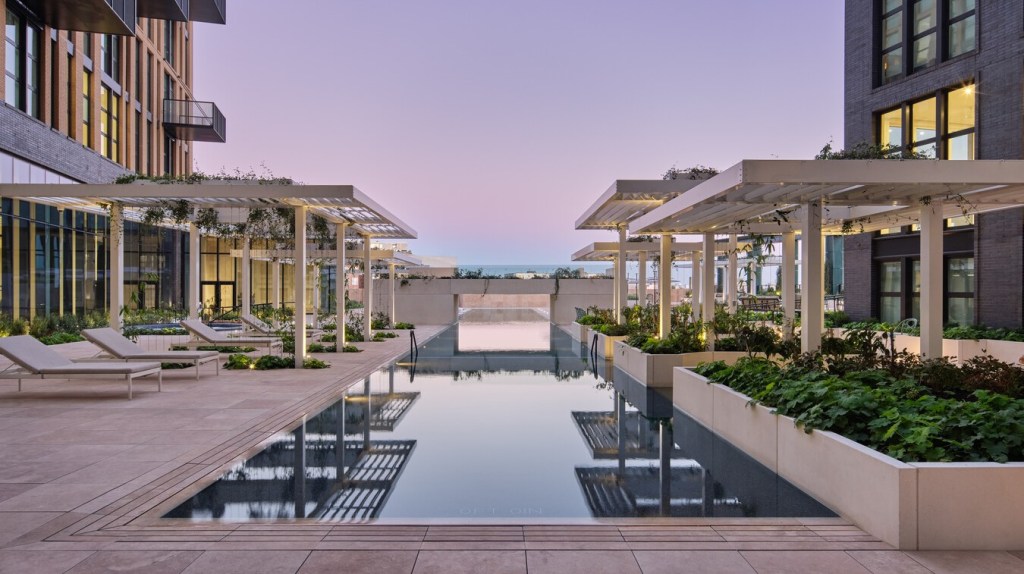 The rectilinear forms of the pools mesh with the building’s modern aesthetic, and partner with the “infinity-edge” style pool gutter for a seamless feel.