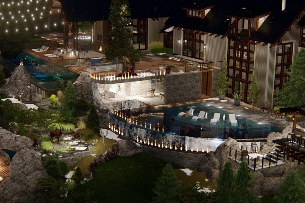 The design needed to meet several criteria, including that it blend with the hybrid rustic/modern industrial home, frame the views, enable lap swimming; accommodate up to 25 people for parties, and include: a spa that seats 8 to 10; fire-and-water elements; a waterslide; spaces to showcase outdoor sculptures and other art; an outdoor kitchen; bunkhouse; and access to the lake below.
