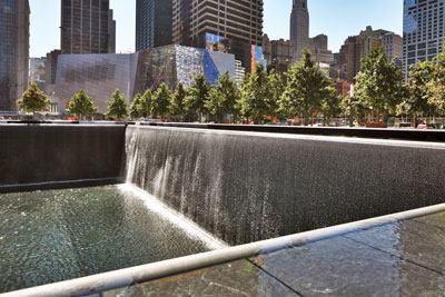 Though the memorial incorporates a large pedestrian concourse adorned with trees, its heart is formed by a pair of square voids reaching 30 feet beneath ground level. Ceaseless streams of water flow down their walls.