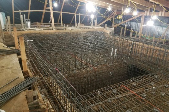 The shallow lounge was built with a 4-foot-thick concrete floor to withstand frost conditions. It is reinforced with a 3-dimensional grid of No. 5 rebar set 12 inches on center, with each cage offset 6 inches.