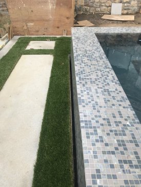 The cover slides along a ledge that was formed in the coping on either side of the pool. It is set 4 inches lower than the coping, and finished in the same glass mosaic tile.