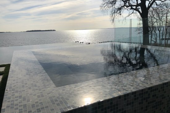 A mix glass mosaic tile in grays, whites and dark blues on the outer walls and perimeter-overflow coping combined with a gray aggregate interior finish to accomplish the muted tones often associated with Northeast structures.