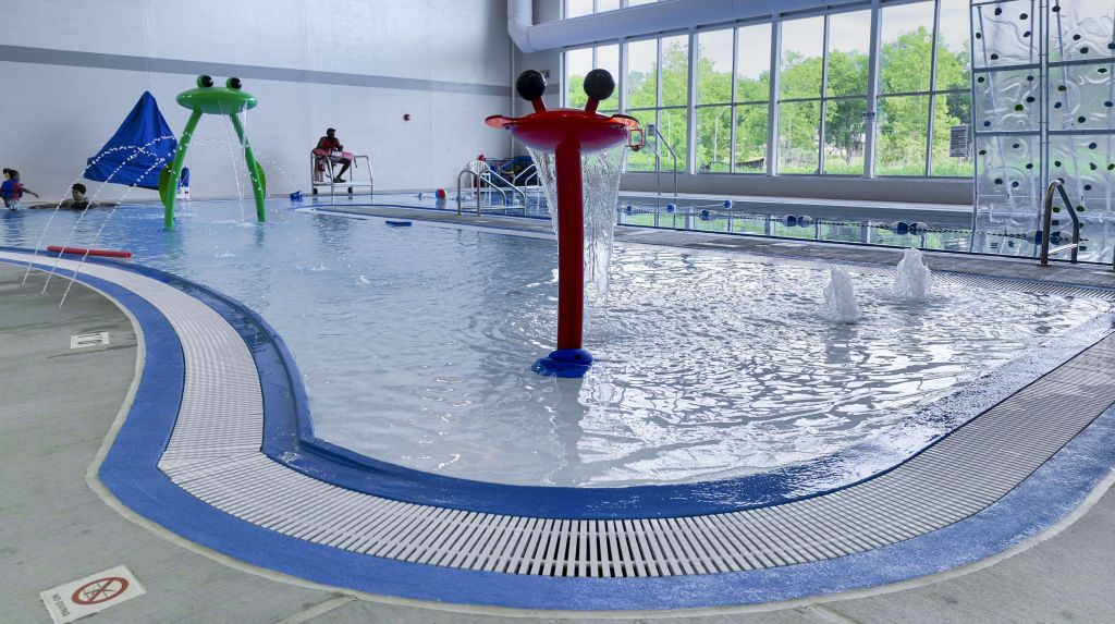 The shallow-water beach-entry area features two large, animal-themed spray features, along with several fountains and jets, and a set of ADA stairs. Next to it sits a 25-meter activity pool, with two swim lanes, a basketball hoop, climbing wall and deep end for lifeguard diving.