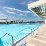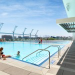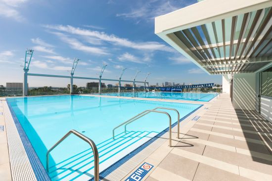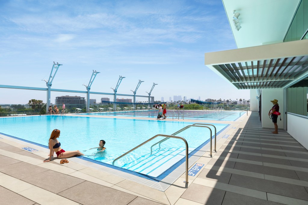 Given that final fact, officials from the City of West Hollywood had no interest in a closed-in natatorium. A set of rooftop pools provided the answer, offering fun and sun in a minimal footprint, all while leveraging iconic city views, including the Hollywood Hills directly north and downtown Los Angeles about 10 miles southeast. Eclectic artwork, bold colors and inclusive amenities such as family-style restrooms welcome visitors from all backgrounds and orientations.