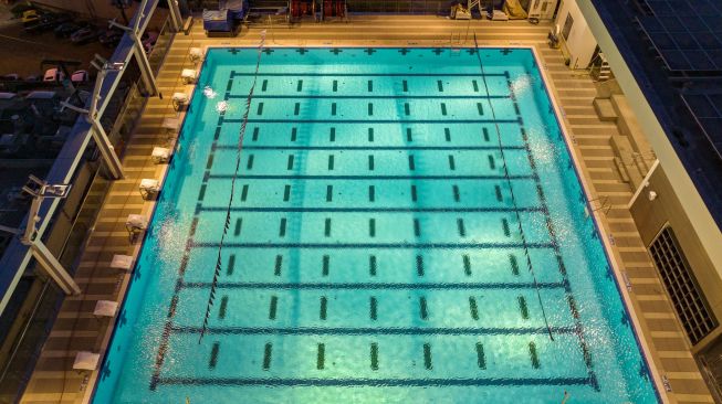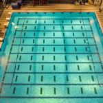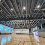 To suspend and support the pools, engineers employed a two-way trussed steel space frame system spanning 100 by 160 feet, supported by exterior concrete bearing and shear walls. This system removed the need for structural columns. In addition, a 15-foot-deep box truss, placed between the pools, supports the 400,000 gallons of water and associated live loads. The system allowed the team to provide support while maintaining clearances for the gym below and the tennis court adjacent. The gridlike system is exposed to the gym below, making for an interesting ceiling.